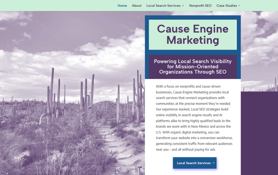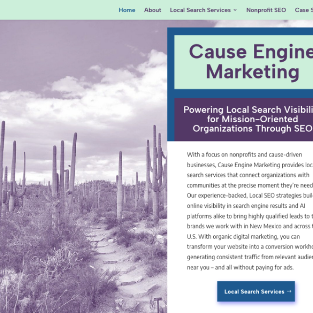 With a focus on nonprofits and cause-driven businesses, Cause Engine Marketing provides local search services that connect organizations with communities at the precise moment they’re needed. Our Local SEO strategies build online visibility in search engine results and AI platforms alike to bring highly qualified leads to the brands we work with in New Mexico and across the U.S. With organic digital marketing, you can transform your website into a conversion workhorse, generating consistent traffic from relevant audiences near you – and all without paying for ads.